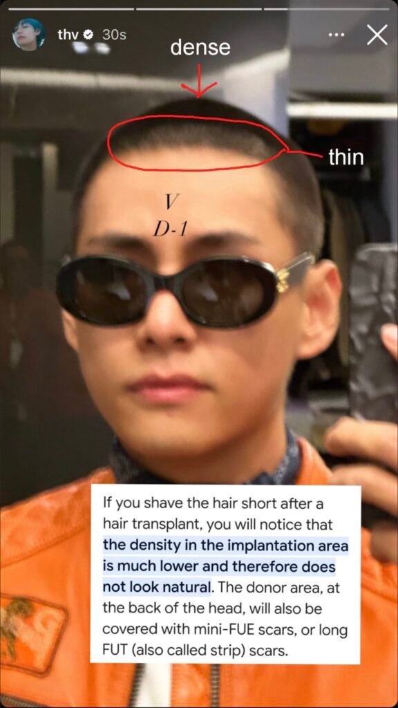 على وجه الخصوص , بدأت الشائعات بعد مشاركة ذ لصوره و هو حليق الشعر استعدادا للخدمة العسكرية , حيث ادعى بعض مستخدمي الإنترنت أن مقدمة الشعر كانت مرتفعة و ثخينة قليلا و هذا ما يؤكد بأن كيم تايهيونغ قد خضع لعملية زراعة الشعر .