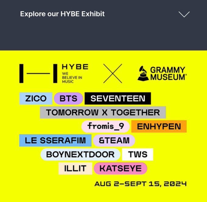 في التاسع من يونيو، أُعلن أن شركة HYBE ستتعاون مع متحف جرامي لإقامة معرض خاص لفنانين الشركة. ويقال إن معرض “HYBE: نحن نؤمن بالموسيقى، معرض متحف جرامي” يحتوي على عناصر من فناني الشركة في أحد أكبر معارض المتحف حتى الآن.