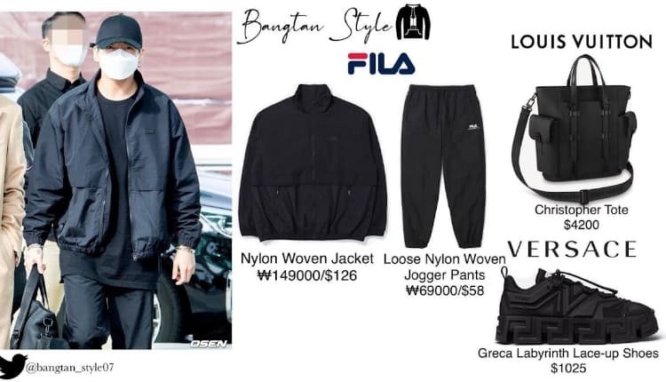 اطل جونغكوك بمظهر مثير كجاسوس أنيق للغاية . من خلال اختياره اللون الأسود ٬ مع مزج موفق للعلامات التجارية مثل FILA و Louis Vuitton و Versace . مظهر فريد حقا للماكني الذهبي .