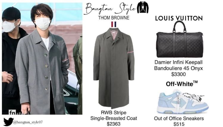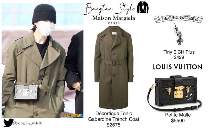 كانت اطلالة جيمين غامضة بعض الشيء مع معطف المطر الطويل من Maison Margiela وقبعة سوداء مع اضافة صائبة بحقيبة Louis Vuitton Petite Malle.