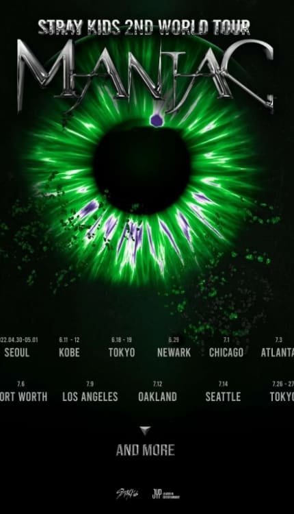 أول حفل موسيقي في سيول ، و ستشمل حفلات Stray kids 2022 من جولتها العالمية الثانية عدة دول بما في ذلك اليابان والولايات المتحدة ، قبل العودة إلى طوكيو في نهاية الجولة.ألمح ملصق جولة ستراي كيدز العالمية الثانية Maniac الذي تمت مشاركته على حسابات المجموعة على وسائل التواصل الاجتماعي إلى أنه سيتم إضافة مدن أخرى قريبًا إلى خط سير الرحلة ، مع “والمزيد” مكتوبًا في الجزء السفلي من الإعلان.