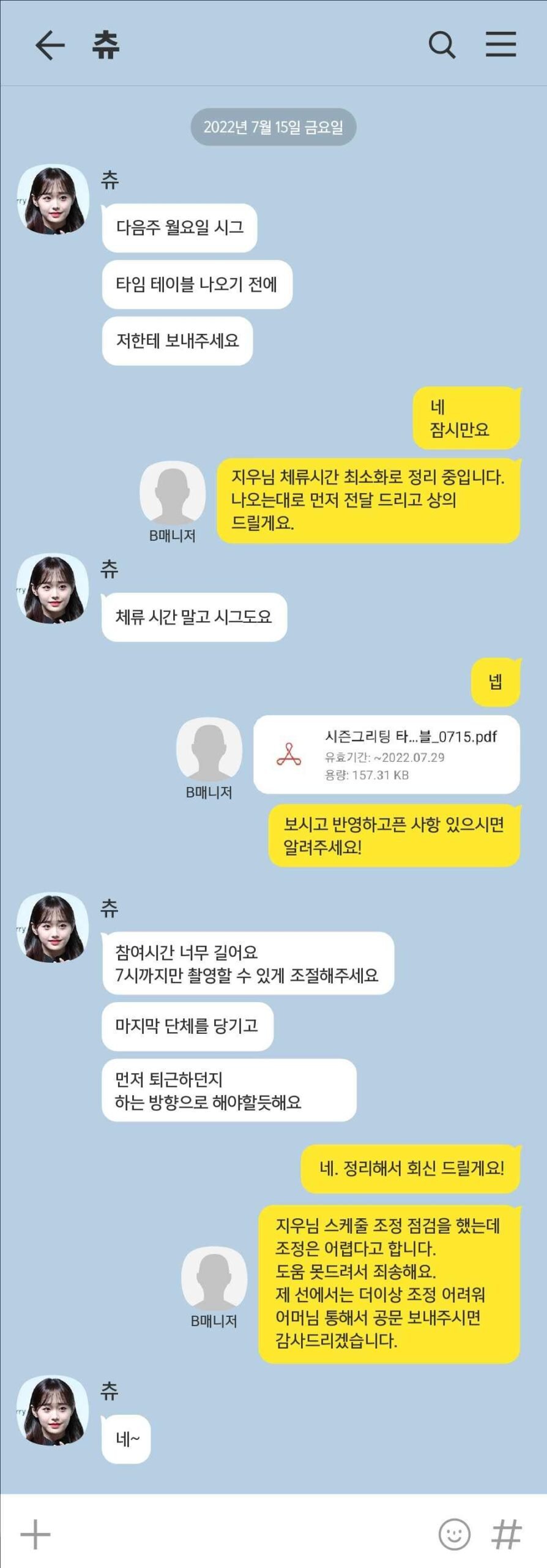 - في سلسلة أخرى من الرسائل ، يمكن رؤية تشوو وهو يهدد بعدم المشاركة في سلسلة وثائقية بسبب وقت الانتظار. شوهد المدير أخيرًا وهو يتراجع ويعتذر لـ تشوو ويعد بالعمل على تقليل وقت انتظار الآيدولز في المستقبل.