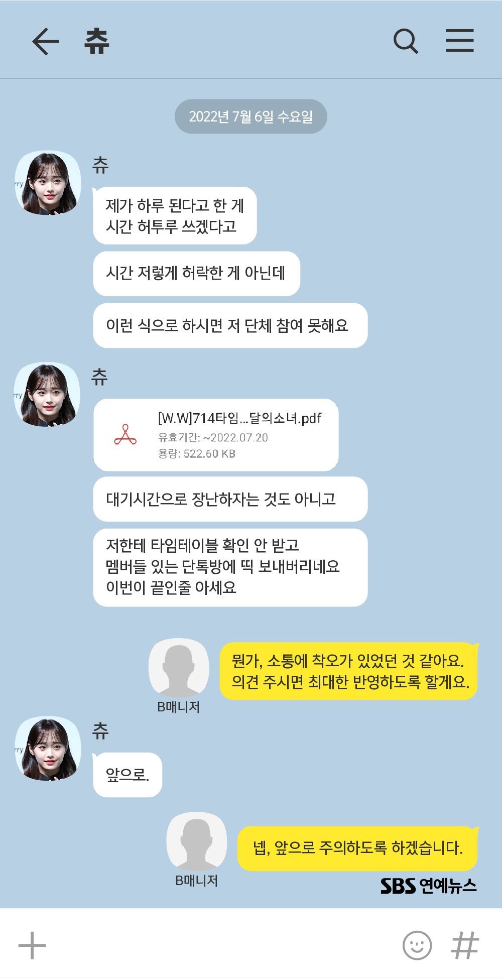 زعمت SBS News أنه في الرسائل النصية الجديدة التي تلقوها ، بدا أن Chuu يطلب معاملة تفضيلية على حساب أعضاء LOONA الآخرين.