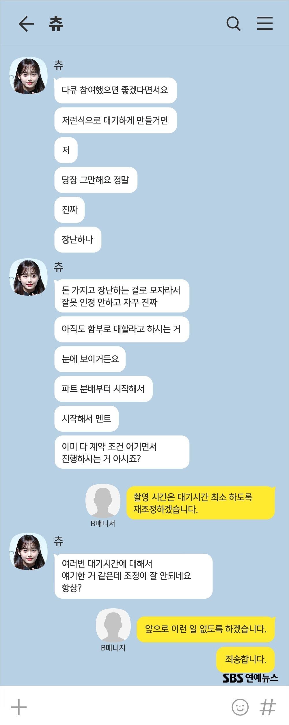 في إحدى الرسائل النصية ، شوهدت تشو وهي توبخ مديرها لعدم تأكيد جدول التصوير القادم معها.