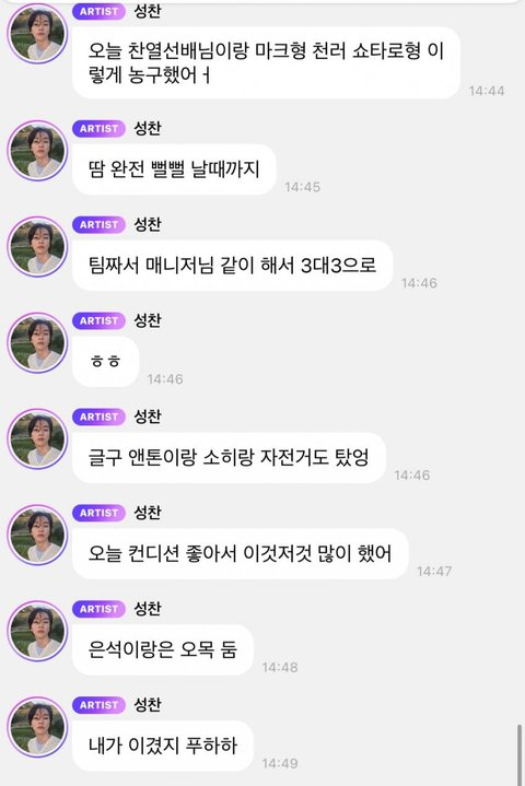 لعبت اليوم كرة السلة مع تشانيول سونباي-نيم، ومارك هيونغ، وتشينلي، وشوتارو هيونغ. لعبنا حتى تبللنا العرق.
