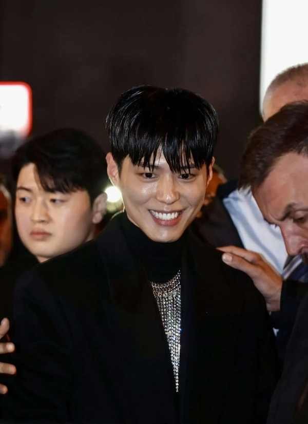 ارتدى الممثل بارك بوقوم معطفًا أسود مع سترة سوداء بياقة مدورة. ألق نظرة على صور تاي و ليسا و بارك بوقوم ادناه .