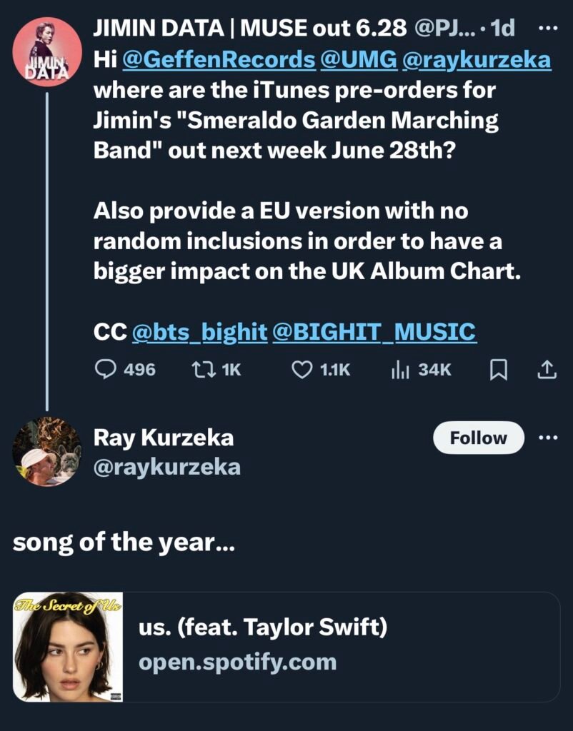 @GeffenRecords و@bts_bighit يرجى النظر في هذا السلوك غير المهني للغاية من @raykurzeka. الآن لن أتفاجأ إذا أفسد الأسبوع الثاني لجيمين. ربما كل إصدارات BTS الأخرى.