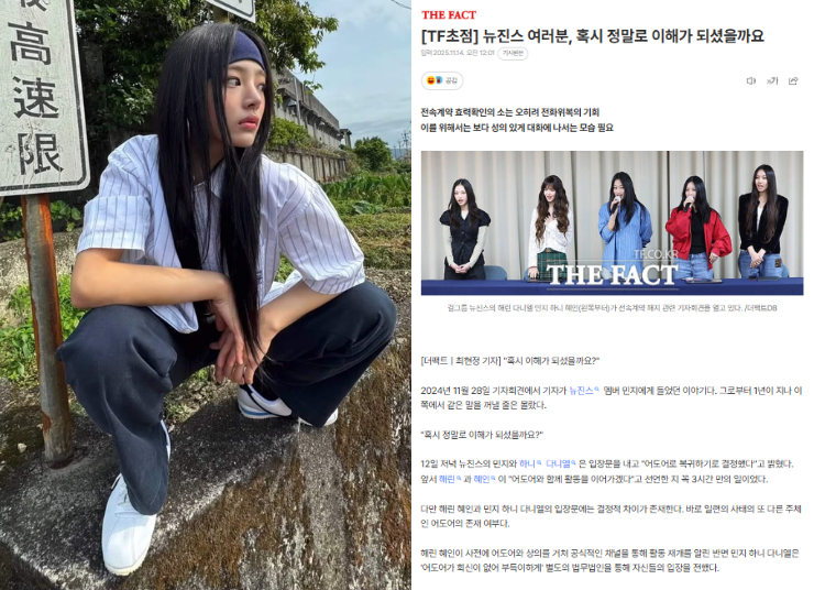 مؤخرًا، نشر الصحفي نفسه مقالًا يذكر الحادثة. كتب قائلا: “هل فهمت حقًا؟” هذه كانت الجملة التي سمعتها من عضوة نيوجينز مينجي في مؤتمر صحفي بتاريخ 28 نوفمبر 2024. لم أتوقع أنه بعد مرور عام سأقول الجملة نفسها من هذا الجانب.” حيث اشار الصحفي في مقالها إلى أن إنهاء العقود لا يكون بمجرد الإعلان فقط فهي تتطلب اجراءات قانونية دقيقة.