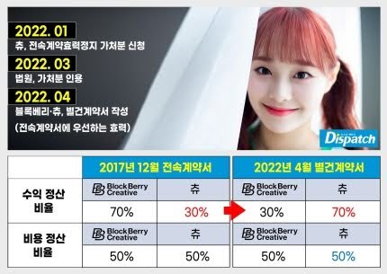 لقد تحول المد لصالح تشو ، والآن أصبح المد اليائس هو BlockBerry Creative. حتى الآن ، أنفقت الشركة 15.0 مليار وون كوري (حوالي 11.5 مليون دولار أمريكي) على LOONA. لم يكن لدى الوكالة أي خيار سوى محاولة التمسك بـ تشوو من أجل المجموعة. تقترح الوكالة تغيير العقد الأصلي.