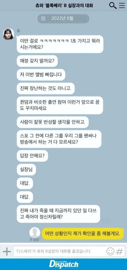 ستغادر Chuu LOONA. لا ، لقد تم طردها. والسبب في ذلك هو استغلالها لسلطتها. كشفت BlockBerry Creative عن رسائل نصية تم إرسالها بينها وبين أحد الموظفين (من أغسطس 2021 إلى يوليو 2022) كدليل.
