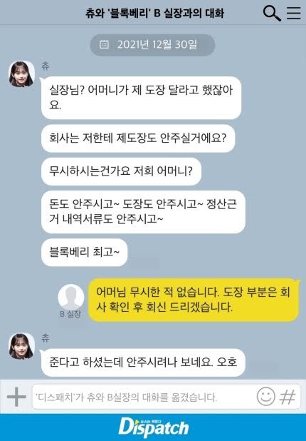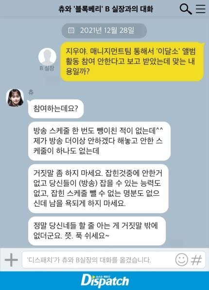 في المقال ، أصدرت ديسباتش عدة رسائل نصية بين تشو والموظفين في الوكالة سلطت ضوءًا جديدًا على الخلاف بين الوكالة والفنان.