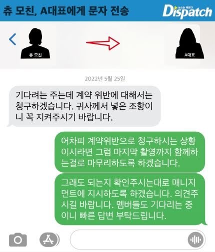تطلب والدة تشو من الرئيس التنفيذي A دفع 50.0 مليون وون كوري (حوالي 38200 دولار أمريكي) لانتهاك العقد . ماذا حدث؟ لقد ألمحت إلى أن “25 مايو بالفعل”. تدعي أن التأخير في تصوير الفيديو الموسيقي سبب لانتهاك العقد.