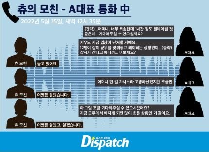تلقت Dispatch تسجيلاً لمحادثة هاتفية بين الرئيس التنفيذي A و تشوو والموظف B و تشوو ، والدة تشوو والمدير التنفيذي A ، ووالدة تشوو والموظف B. ديسباتش تمكنت من الكشف عما كان يجري من خلال هذه المحادثات.