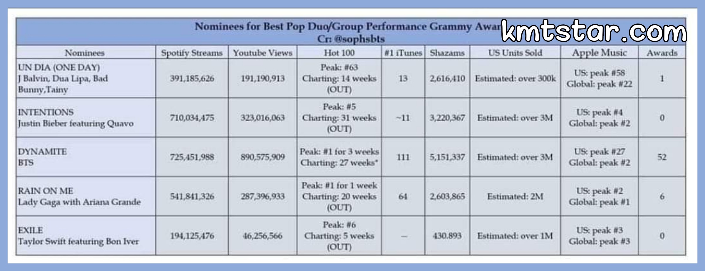 و خسارة فرقة bts  في الحفل عزز الإتهامات ضد لجنة تحكيم الحفل ٬ فمع إنجازات تاريخية كبيرة توقع العديد من الأرمي فوز فرقتهم ٬ و التي استطاعت تسجيل أرقاما قياسية بأغنية داينميت تخطت أرقام المرشحين لنفس فئة الجائزة بكثير.
