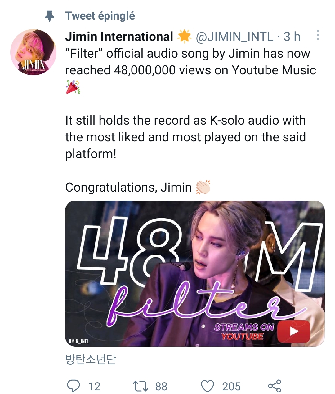 ويبدو أن جيمين يحكم قبضته على اليابان بعد  تصدرته قائمة أفضل الكيبوب لعام 2020 بأغنيته المنفردة Filter على الموقع الياباني Line Music Japon . لتصبح بذلك  أكثر أغنية منفردة  مشاهدة و تقييماً  لفرقة Bts . كما  حصلت أغنية Filter  على أكثر من 48 مليون مشاهدة على Youtube  . ما يجعل منها أكثر أغنية منفردة ل Bts مشاهدة . كما تم إدراج أغنية  Friends  من غناء و إنتاج جيمين من فرقة Bts  في المخطط  Line Music Japon .