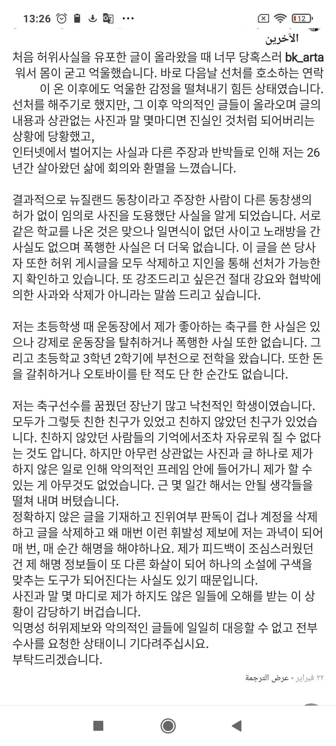 كنت مصمماً و بشدة على عدم الرد على المشاركات المجهولة و الخبيثة ، لكنني لا أستطيع تحمل ذلك , هذا هو السبب في أنني أكتب هذا المنشور .كيف يفترض بي أن أثبت الحقيقة ؟؟ كيف لي أن أتذكر و أن أثبت أحداث وقعت قبل 11 أو 16 سنة مضت؟ صحيح أنني لست شخصاً لم يقم بأذيت أي أحد ، و لم أعامل الجميع كقديس . في ذلك الوقت أخذ الناس أموالي فقط لأنني كنت صغير الحجم ، و هناك أوقات تم شتمي بها . هل يجعلني هذا ضحية الآن ؟؟ أعتقد أن المدرسة مكان للطلاب الذين لم يكوّنوا بعد شعوراً بالذات عن طريق التجربة و الخطأ ، الصراعات و الدروس ليصبحوا أشخاصاً بالغين و أفراد جيدين في المجتمع ، لقد مرّرت أيضاً بكل هذه المراحل . و مع ذلك ، فقد كان الأمر ضمن الحدود القانونية و الأخلاقية ، لن أنكر ذلك ، لماذا عليّ الإعتذارعن وقت لم أحلم فيه بعد بأن أصبح ممثلاً و طفولة طائشة فقط بسبب وظيفتي ومسؤوليتي كممثل ؟؟ إذا كانت هذه هي المشكلة ، أعتذر . أنا آسف . لم أكن مقرباً من الجميع في الصف في كل مدرسة أذهب إليها ، لم أكن صديقاً للجميع أيضاً. كنت قريباً من حفنة من الأطفال ، و كان أصدقائي أشخاصاً طيبين حقاً . لا بد أن شبكتي الإجتماعية الصغيرة وإهمالي لأولئك الذين لا صلة لهم بي كانت هي المشكلة . لقد إنهارت بالفعل مسيرتي المهنية التي دامت 10 سنوات ، و تم تعليق جميع مشاريع التي كان من المقرر أن أشارك فيها . الضرر يصل إلى رقم لا أستطيع أن أصفه , و الضررالعقلي ؟؟ منذ الإتهامات أبقي عيناي على الأرض عندما أخرج ، لم أنم منذ أسابيع . هل رسالتي محاولة لإثارة التعاطف بينما المنشور الذي نشره شخص مجهول لا نعرف وجهه أصلي ؟؟ لم تضغط الوكالة و المحامي عليك باستعمال المال , و إذا شعرت بالتهديد فكيف أرسلنا شهادة بالمحتويات و نشارك تحديثات الوضع معك ، في حين أنت شخص مجهول يعيش في الخارج . لقد اتصلت بنا أولاً من خلال معارفك و محاميك ،ثم طلبت التساهل ، لماذا ترسل خطاب إعتذار من خلال معارفك و تطلب من المحامي رأيه ؟ لا أفهم سبب تغييرك لموقفك لمجرد أنك غير متأكد مما إذا كنت ستظهر التسامح في حين أنه بالكاد سيكون كافياً إذا كنت قد فعلت ذلك بمحض إرادتك ، تماماً كما فعلت عند تحميل المنشور المجهول قبل طلب التساهل . ولا تضع اللوم على الآخرين عند طردك من عملك لقلة إجتهادك . يعلم هذا الشخص جيداً أنني سأتضرر أكثر إذا ما استمر في التطرق للموضوع و لو من باب الثرثرة . ” المتواطئون “أعتقد أنك تعرف أكثر من أي شخص آخر سبب صياغتها بهذه الطريقة . لم يعد شيء يهم بعد الآن . أشكرك على السماح لي بالرد عليك و أنا خالي الوفاض و بنفس مستواك ، لا أريد التسبب في المزيد من الضرر للأشخاص الذين أهتم بهم و بوكالتي ، و لا أريد أن يمروا بأوقات عصيبة بعد الآن . كنت أرغب في الحفاظ على بعض كرامتي على الأقل ، لكنني إنسان ، و قد أثر ذلك عليّ أنا أضع كل شيء في الأسفل و أشارك كل شيء من أجل حماية نفسي .