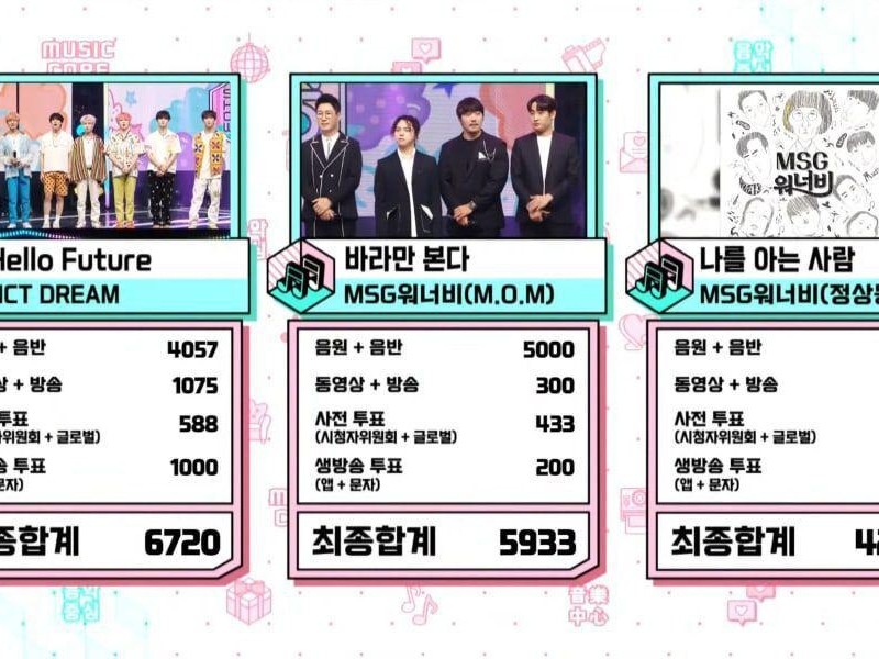 في 10 يوليو من حلقة “Music Core” ( برنامج تلفيزيوني موسيقي تنافسي على قناة SBS ٫ يتم استضافة أكثر الايدولز شعبية ليوؤدوا أحدث أغنياتهم من أجل التنافس على المركز الأول ) ، كانت NCT DREAM بأحدث أغنياتهم “Hello Future” ، و MSG Wannabe بأغنية “Foolish Love” ، و MSG Wannabe بأغنية “Just you ” مرشحين للمركز الأول.